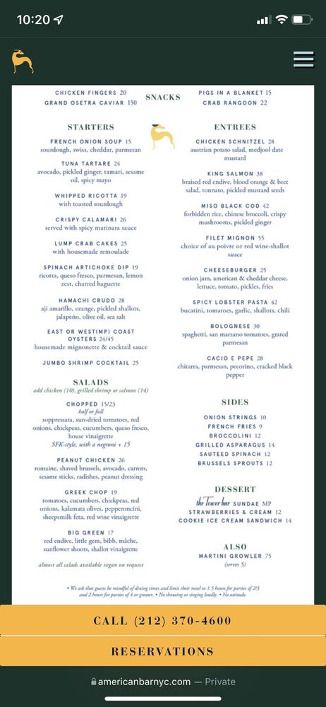 Introducing the menu at American Bar, located in New York City, offers a blend of trendy, romantic, and upscale American cuisine. Their starters range from Tuna Tartare Avocado to Lump Crab Cakes, appealing to seafood lovers. For salads, options like the Chopped Salad and Peanut Chicken Salad showcase fresh ingredients and unique flavor combinations. Entrees like Miso Black Cod and Spicy Lobster Pasta highlight the chef's culinary expertise.